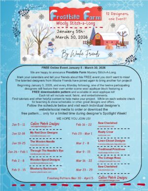 Join us for this mystery stitch-a-long put on by the Woolie Friends Stitchers! The event runs January 5 – March 30, 2026. Our block kits are available for pre-order and will ship January 17, 2026. Our pattern will be available as a free download January 19 – 25, 2026. Other block patterns and kits for the stitch-a-long may be downloaded or purchased by going to the other designers’ websites. Find more details on the informational flyer. Join the Woolie Friends Facebook Group for event news, share photos, how-to videos, and more.