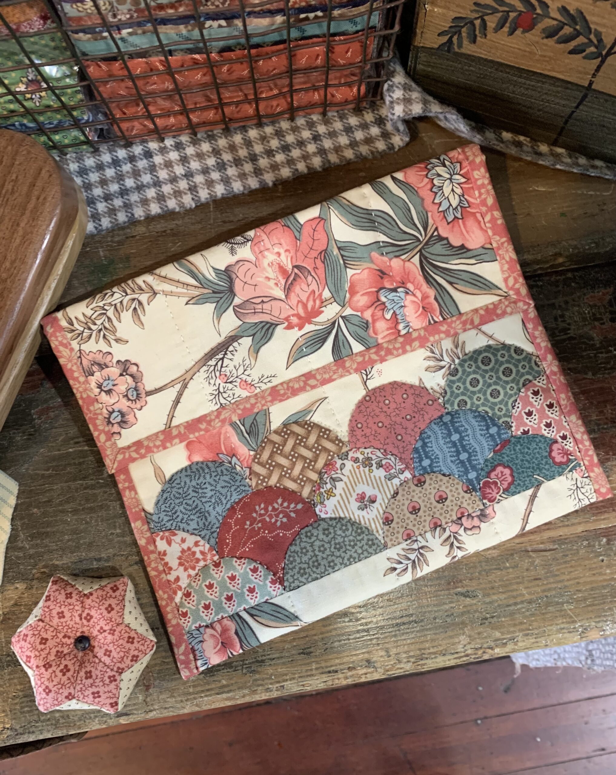 This sweet little pouch measures 7″ x 8 1/2″. Our kit/pattern combo includes the pattern by Karen Styles, the Paper Piece clam shells, an acrylic template, and the cotton fabric needed for the pouch, lining, and binding.