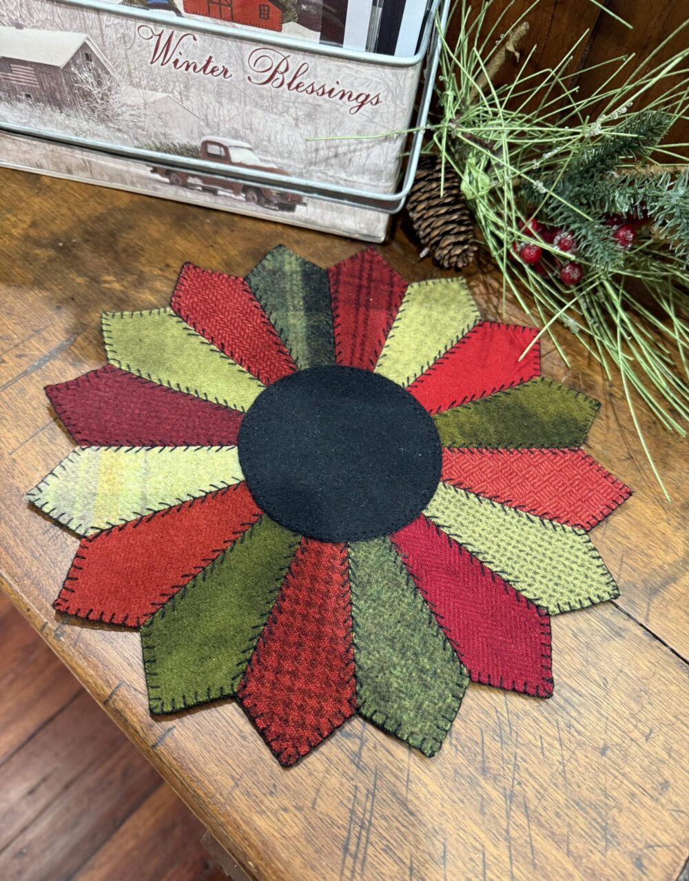 Dresden Plate Mat – measures 11″ across – by Erin Wile Piccini of All About Ewe
