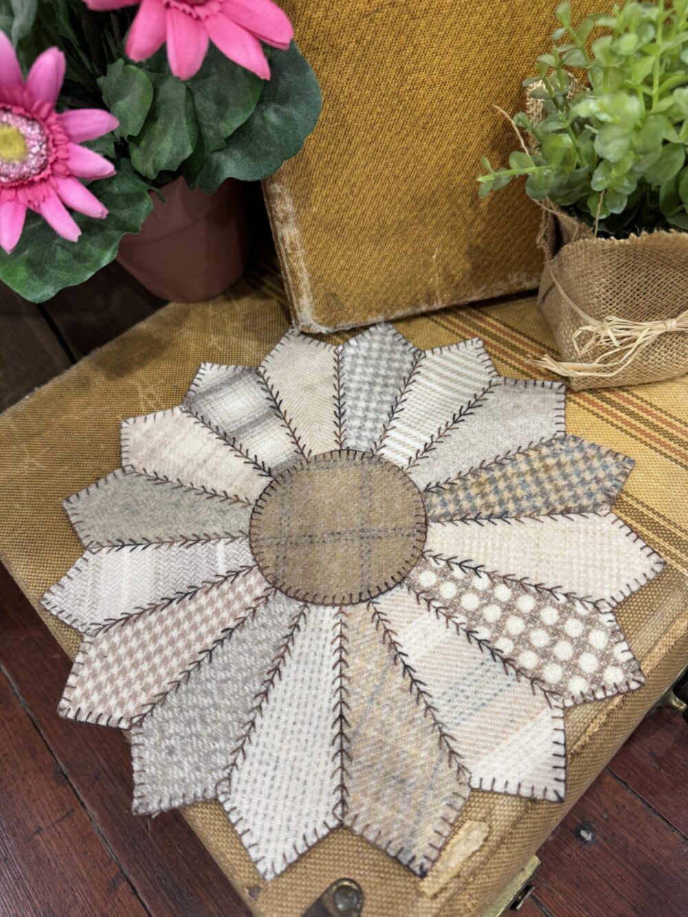 The Dresden Plate Mat is a beautiful remake of a very old much loved quilt pattern. It is great to use as a candle mat, table topper, hung on the wall, or even framed. Our kit/pattern combos includes the pattern, wool, and cotton backing.