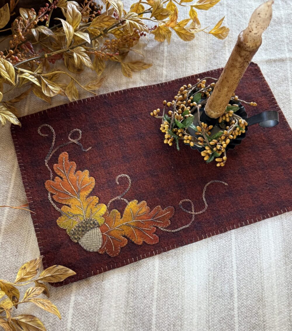 “Fall in Montezuma” is a project we designed for a quilt guild workshop in Montezuma, Iowa. It is a small project that is quick to complete. Fall in Montezuma makes a cute mat for a shelf, table mat, mug rug, or tray topper. Our kit/pattern combo include the pattern, all of the wool you need for the mat, and cotton for the backing.