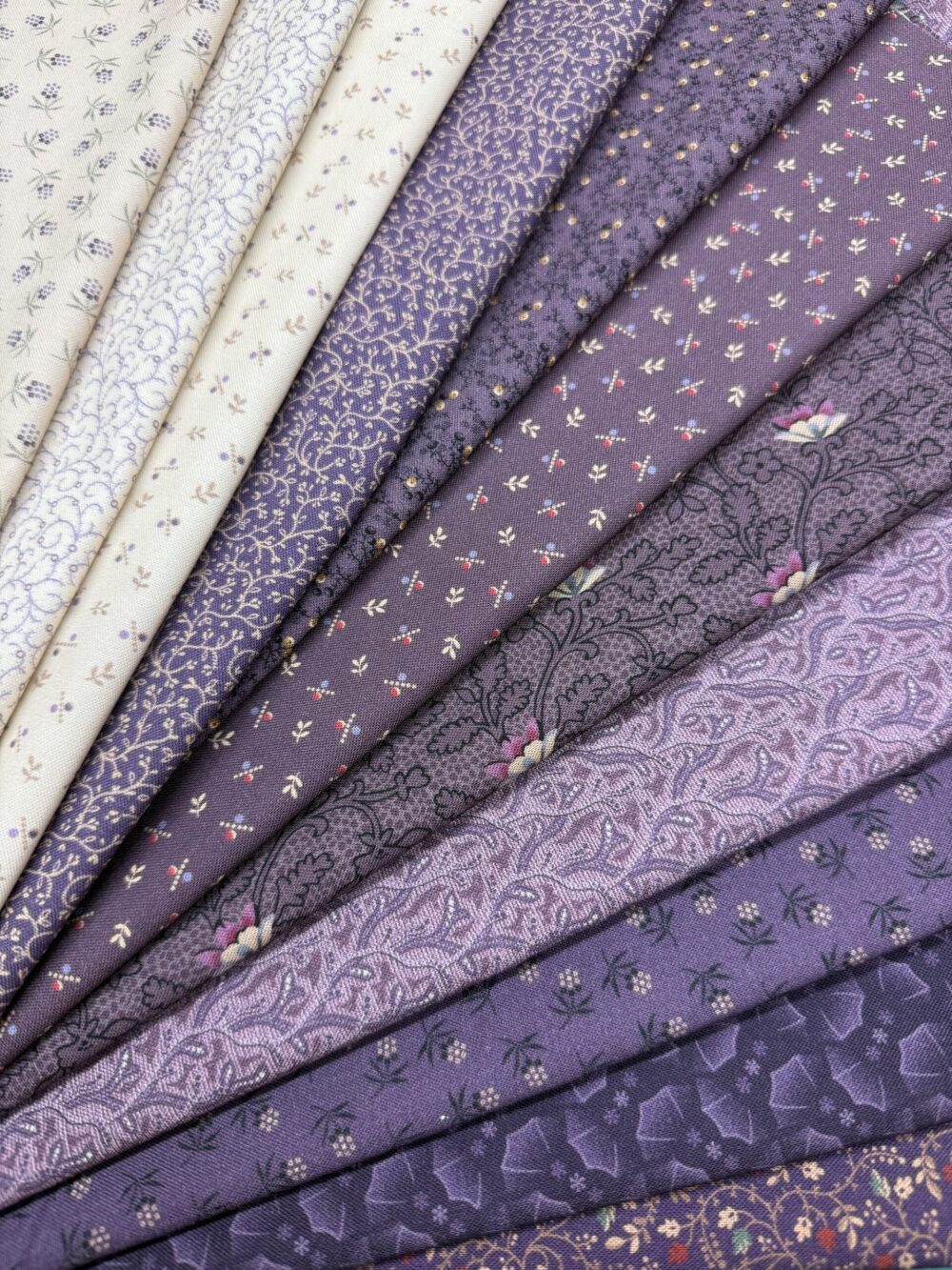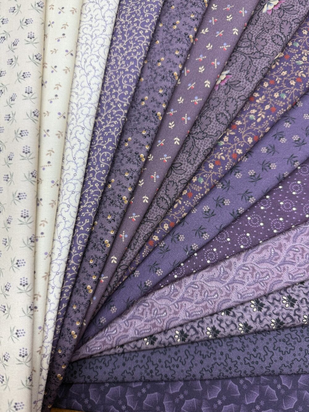 The Plumberry Farm Collection features primitive prints in a wonderful soothing palette. These purple, cream, and lavender prints include patterns of abstract designs, florals, and squiggly lines.
