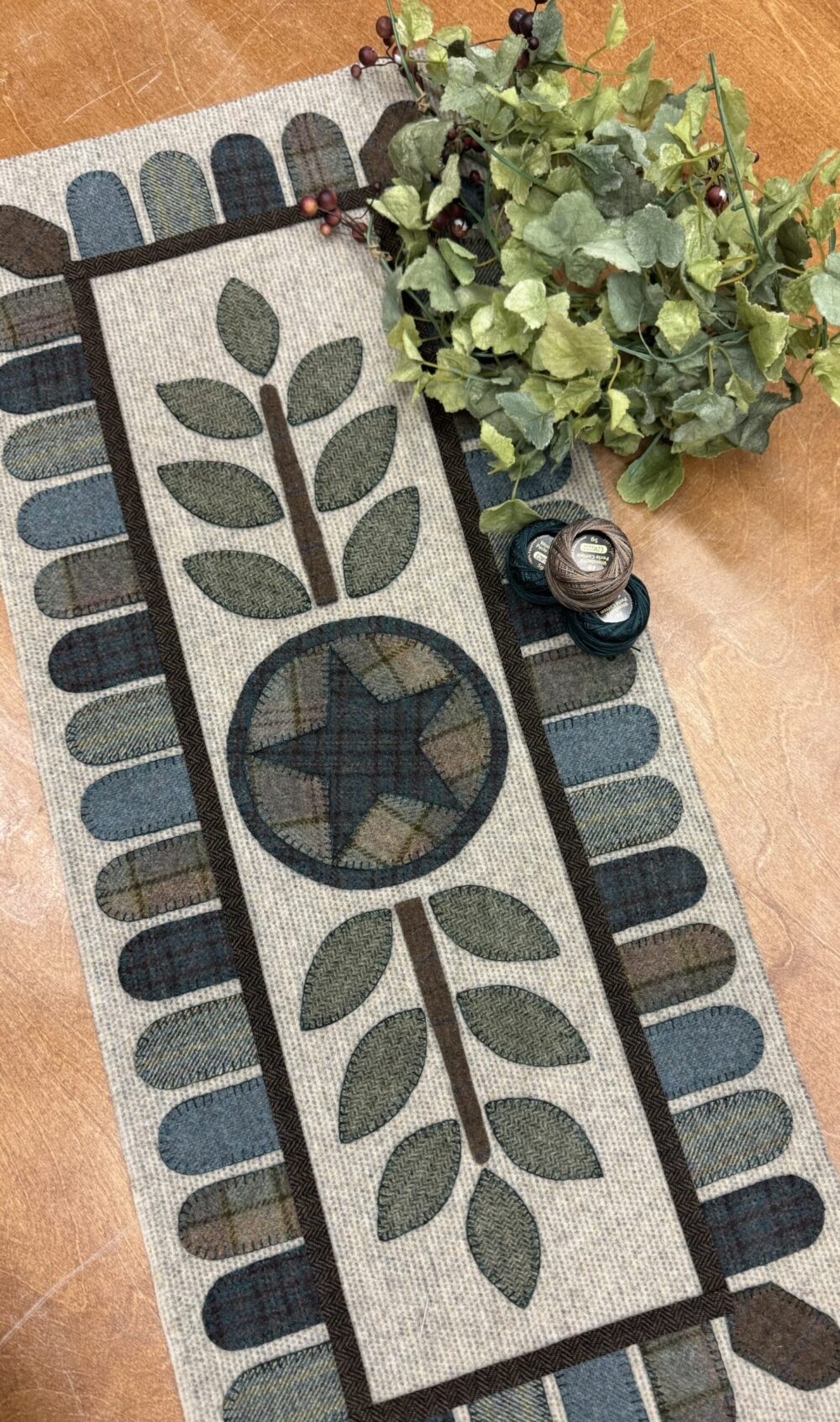 This is a completed wool applique runner that was a shop sample in our store. It is ready for a new home. If you love the design and would like to make one, we have kitted new Settler’s Star kits that are available for purchase.