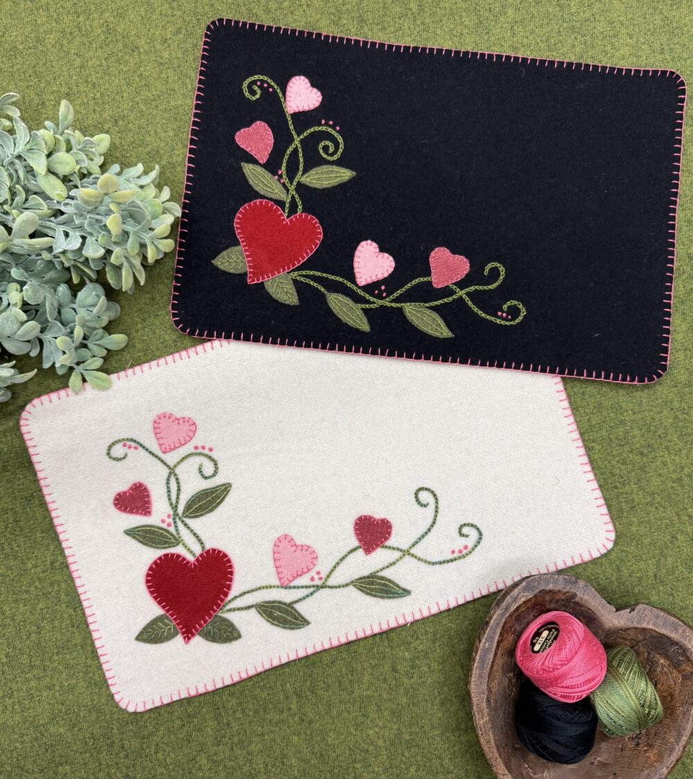 “Sweetheart” is a project we designed for a beginner wool applique class here at The Woolen Needle. It is a small project that is quick to complete. Sweetheart makes a cute mat for a shelf, table mat, mug rug, or tray topper. Our kit/pattern combo include the pattern, all of the wool you need for the mat, and cotton for the backing.
