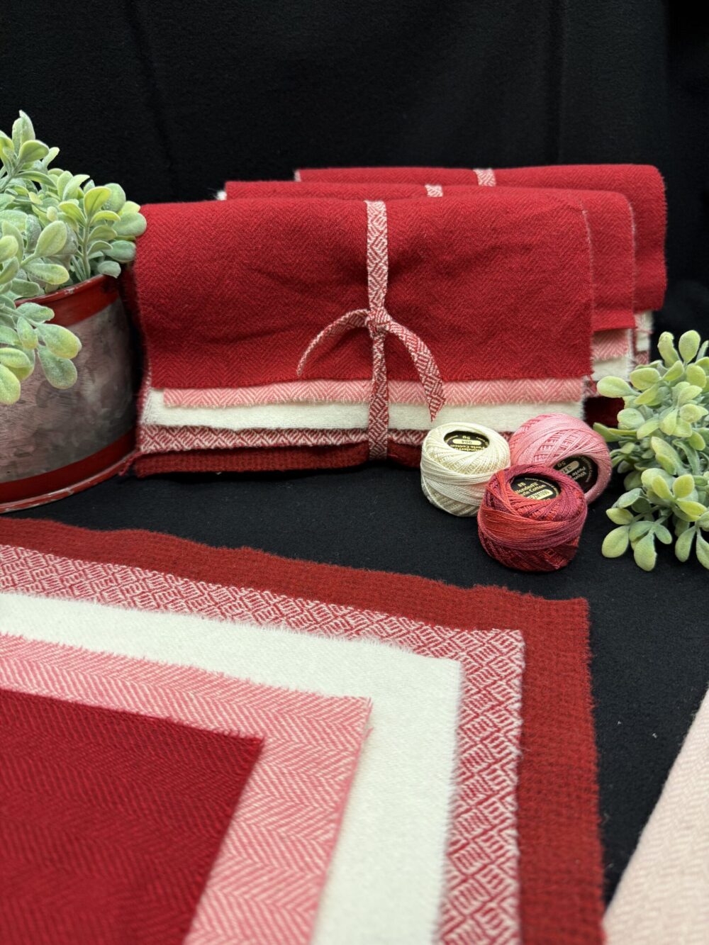 Our Valentine Wool Cake includes 5 pieces (each approximately 9″ x 15″) of felted 100% wool in a variety of textures in colors of pink, red, and cream. This grouping would make several stuffed hearts.