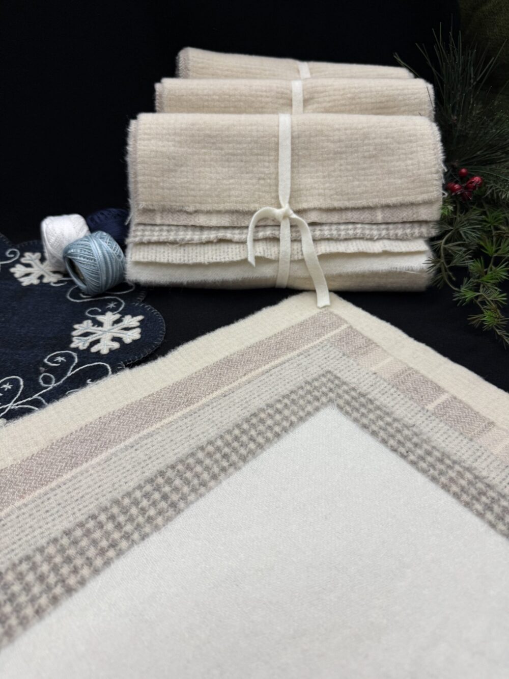 Wool Cakes have five pieces of 100% felted wool in a variety of textures. These wool pieces are approximately 9″ x 15″. They are great for rug hooking and wool applique.
